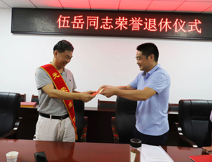 儀式上,董事長(zhǎng)陽(yáng)文林為伍岳同志佩戴了“光榮退休”綬帶,頒發(fā)了“光榮退休”紀(jì)念牌,并代表集團(tuán)公司向伍岳同志為萬(wàn)寶投各項(xiàng)事業(yè)發(fā)展所作出的貢獻(xiàn)表示崇高的敬意和衷心的感謝。總經(jīng)理徐業(yè)波傳達(dá)了相關(guān)文件精神,介紹了退休同志有關(guān)情況,回憶曾經(jīng)與伍岳同志共同奮斗的情誼和榮耀。工會(huì)代表在座談會(huì)上表達(dá)了感恩與不舍的心情,并送上了溫馨的祝福。